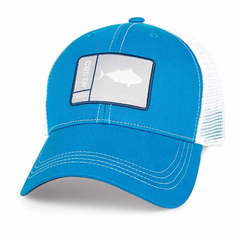 Costa cotton twill with sewn-on woven patch. Adjustable snapback closure and structured front. Imported.