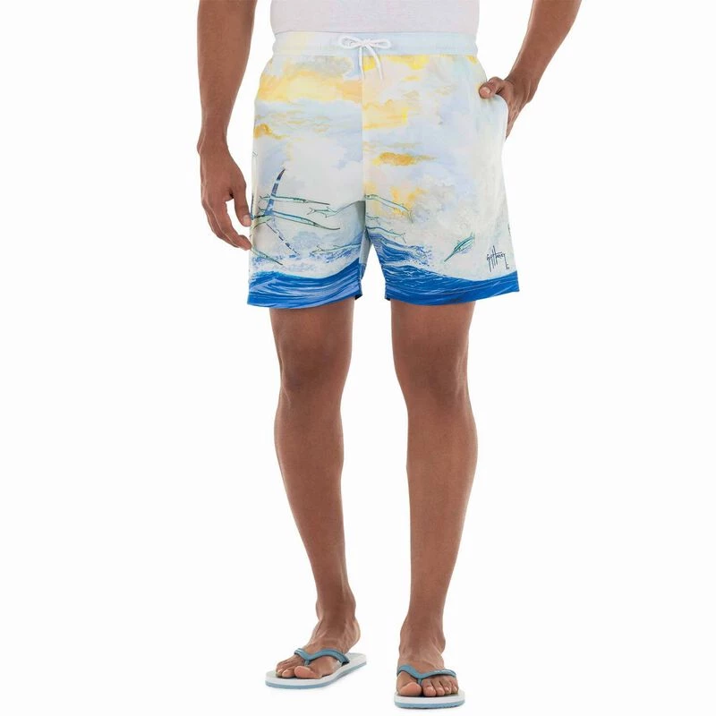 From the beach to the bonfire, you’ll enjoy all-day comfort in these Guy Harvey 7″ volley swim trunks that feature Guy’s original artwork on an allover wrap-around print of a Sailfish. His experience as a diver, angler and marine biologist let him depict in stunning and authentic detail a sailfish against a sunrise. Whether you’re swimming, fishing or playing beach volleyball, you’ll appreciate the comfort of these trunks that are made of 88% polyester/12% spandex fabric with 4-way stretch that moves with you. They also feature handy side pockets and UPF properties. The tag-free label offers added comfort. Machine washable. Help Save our Oceans! Your purchase supports the health of our oceans and marine life. A portion of the proceeds from the sale of all official Guy Harvey merchandise benefits the Guy Harvey Ocean Foundation, which conducts scientific research and hosts educational programs to help save our seas. Imported.