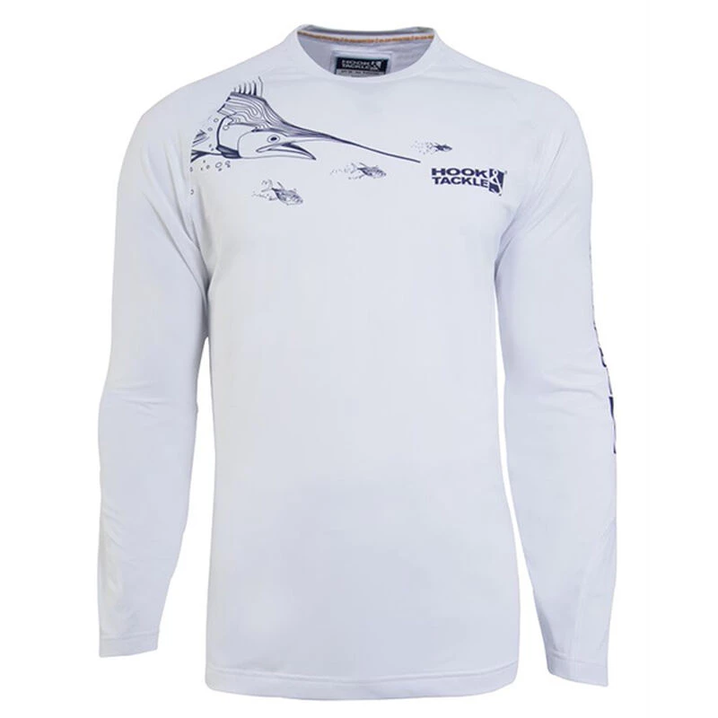 Hook & Tackle’s® Marlin Chase shirt features a marlin chasing fish and the Hook & Tackle logo on the front and the sleeve. It’s made with a fish flex cross-channel, 90% polyester 10% spandex stretch comfort fabric that goes with you, wicks moisture, radial sleeves for expansive arm movement, UPF 50+ sun protection to block sun’s harmful UV rays and also features a rear vent to keep you in breathable comfort. Imported.