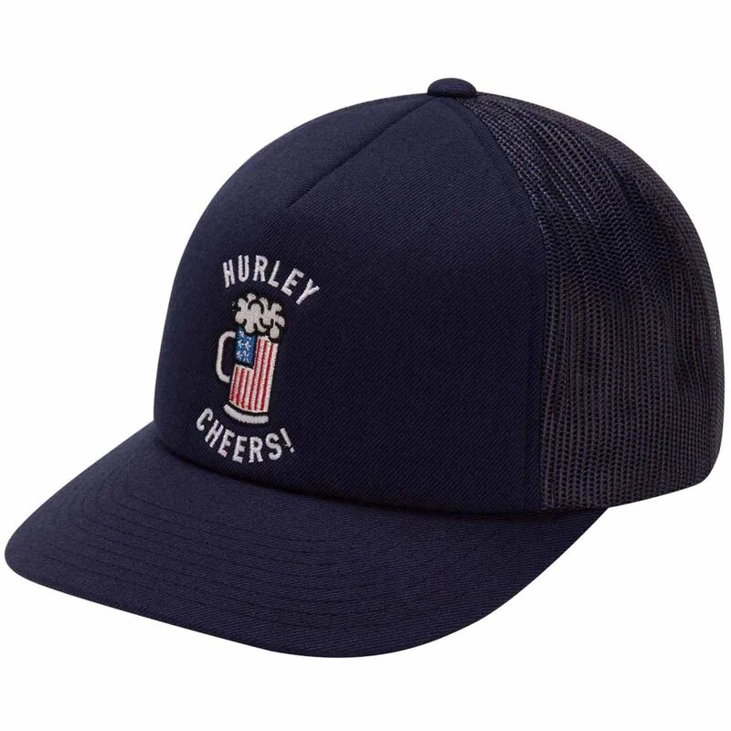 Toast America with the Hurley Cheers Bro Hat. Featuring a celebratory front silicone print, this foam crown, adjustable snap-back hat has mesh side panels for breathability and comfort.