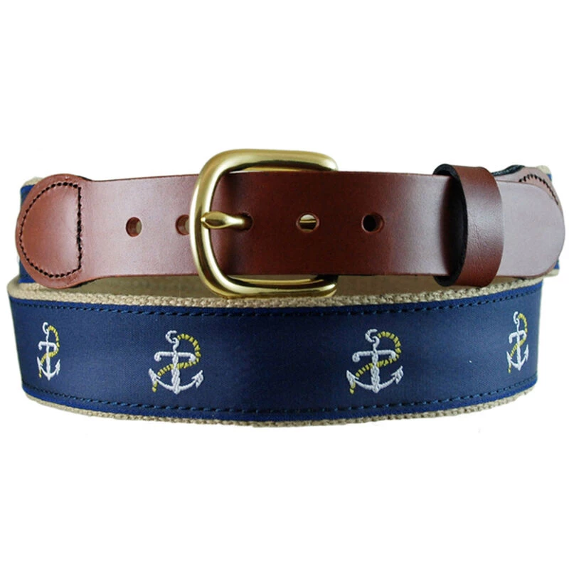 Leather Man belts are constructed with heavy-weight, vegetable tanned leather tips with hand-buffed and dyed edges. They feature custom-made, woven ribbon and a low-lead, brass harness buckle. Hand-made in the USA and created with impeccable workmanship, this belt compliments boating casual to business casual styles.