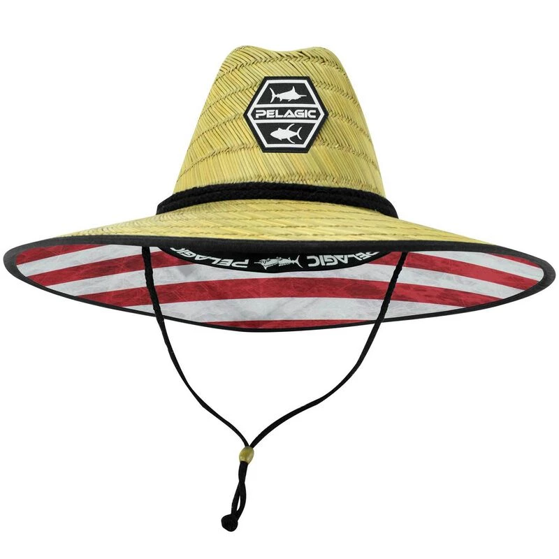 Take a trip south of the border and soak up the sun’s rays with the Baja Straw Sunhat! This 100% Natural Fiber “lifeguard-style”, full-brim hat features a front embroidered marlin patch with custom Pelagic elastic sweatband on the inside of the hat and our Americamo print on the under-brim. Imported.