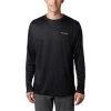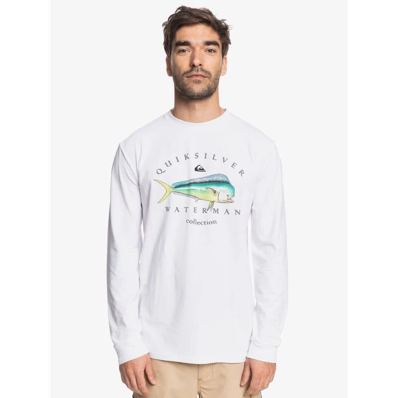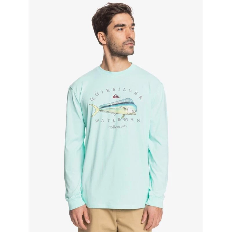 Long sleeve shirt for men featuring lightweight cotton elastane blend fabric, and a screen print on the chest. Complete with UPF 50 sun protection. Imported.