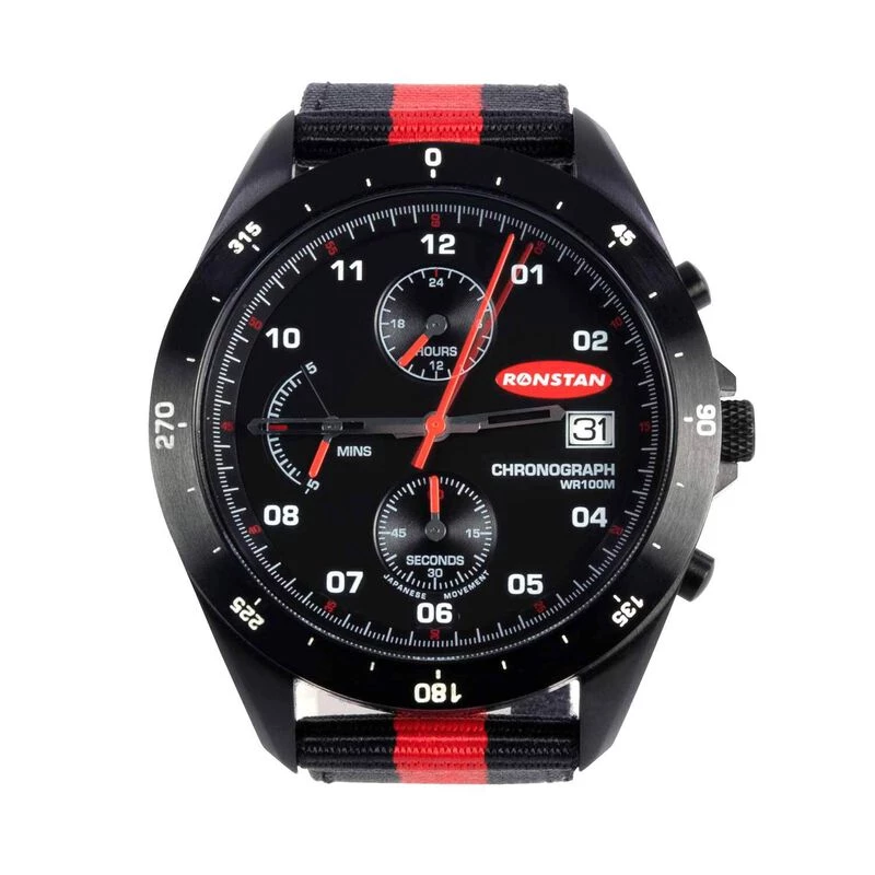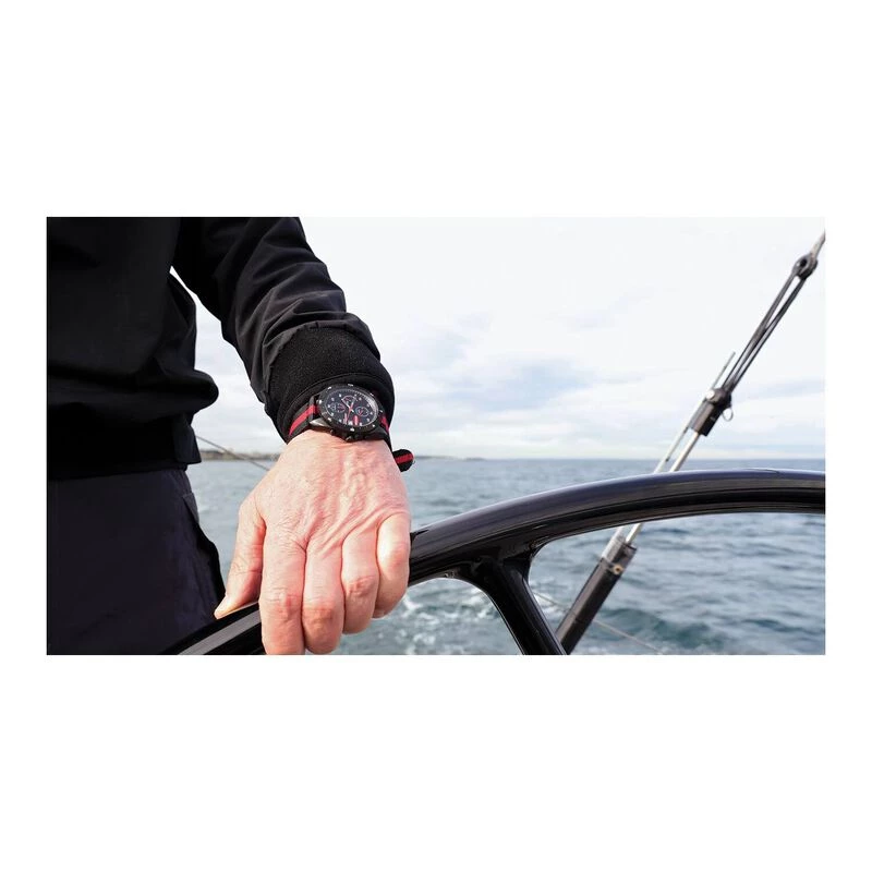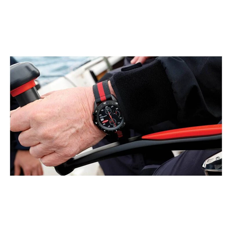 Ronstan’s ClearStart 45mm Analog sailing watch; featuring a precision analog quartz display. Brushed matt black stainless steel housing, hard mineral crystal lens, 12/24 hour time display with date window.