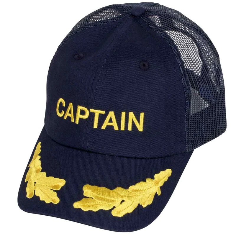 Nautical style embroidery references traditional yacht captain hats while the longer bill protects your face from the sun. Mesh panels at the back of the hat provide ventilation to help keep you cool while you’re on the water. In case there’s ever a question of whos in charge, “Captain” is embroidered in gold across the front of the hat.
